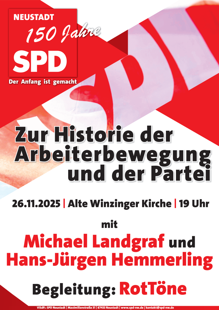 Die SPD Neustadt feiert 2025 ihr 150stes Jahr seit ihrer Gründung. Hierzu wurde bereits viel gefeiert, aber auch in der Geschichte geforscht. Am Mittwoch dem 26. November, 19:00 Uhr, werden die Ergebnisse dieser Rückschau in der Alten Winzinger Kirche in einem Vortrag zur Geschichte der Arbeiterbewegung in der Region und zur bewegten Geschichte der Neustadter […]