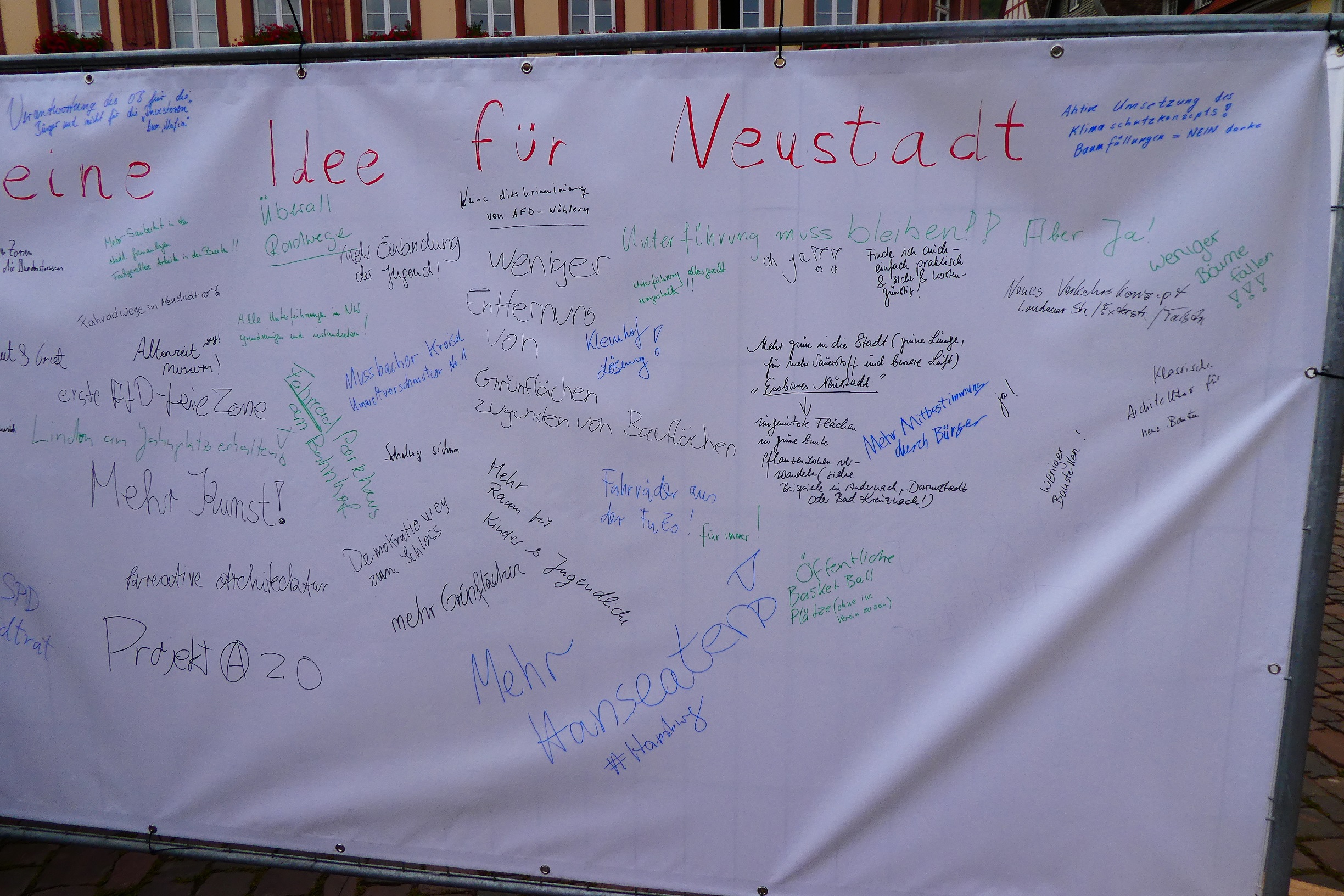 „Mehr Radwege“, „Öffentliche Basketballplätze“, „Klemmhof-Lösung“, „Mehr Raum für Kinder und Jugendliche“ oder „Macht mehr Musik“. So lesen sich Kommentare auf der großen Plane unter dem Titel „Deine Idee für Neustadt“, die am vergangenen Freitags Nachmittag auf dem Marktplatz zum Mitmachen einlud. Wir wollten die Idee des Demokratiefestivals, das an diesem Wochenende auf dem Schloss stattfindet, in die Mitte der Stadt tragen. Die Plane zu Neustadt war in einem Dreieck mit den weiteren Aufforderungen Ideen für Deutschland und für Europa aufzuschreiben und zu diskutieren aufgestellt. Wir wollen die Bürgerinnen und Bürger einbinden und Lust machen auf die demokratische Diskussion. Das haben wir am Freitag erreicht. Einige der Passanten kamen beim Lesen und kommentieren in angeregte Diskussion.