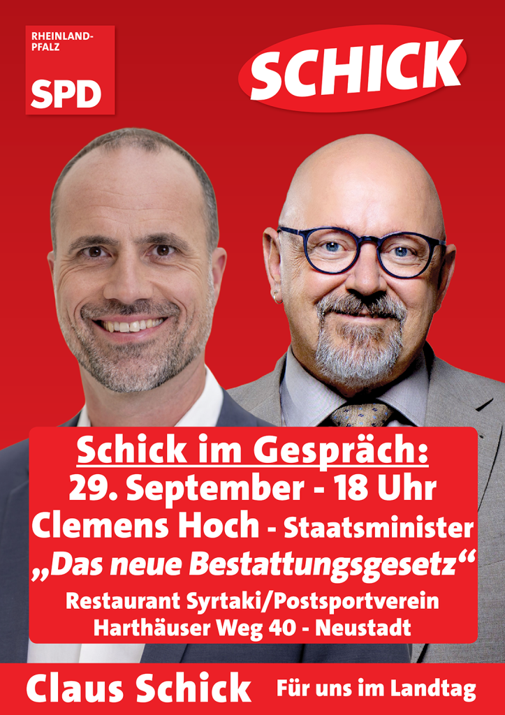 Fragen wie diese können am Montag, den 29. September um 18 Uhr in der Gaststätte „Syrtaki Taverna“ beim Postsportverein Neustadt (Harthäuserweg 40) beantwortet werden. Zur Vorstellung des neuen Bestattungsgesetzes hat unser Landtagsabgeordnete Claus Schick Clemens Hoch, Staatsminister, nach Neustadt eingeladen. „Der Minister wird uns informieren und gemeinsam können wir über die Fragen der Umsetzung des Gesetzes diskutieren“, lädt Claus Schick ein.